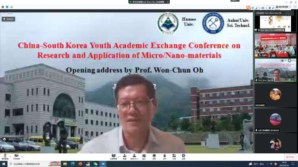 6月26日下午,由安徽理工大学材料科学与工程学院、韩瑞大学先进材料科学与工程系、安徽省纳米碳基材料与环境健康国际联合研究中心共同发起举办的“中韩微纳米材料研究与应用青年学术交流会”顺利召开。本次交流会围绕“Macro and Nano Based Materials and Application: Basic synthesis, Electronic, Environmental and Biomaterials”主题展开,来自韩瑞大学、安徽理工大学材料学院的教师、研究生及部分本科生,共150余人以线上+线下的方式参加了会议。