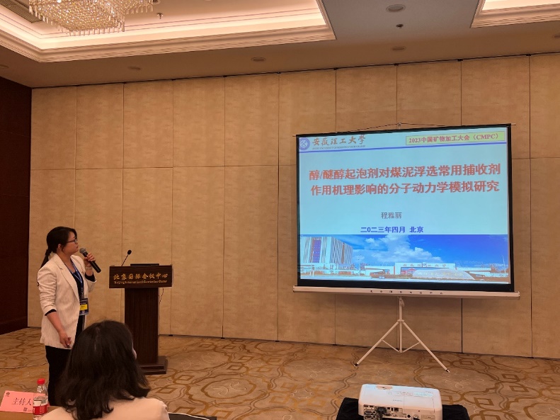 会议期间,王传真、朱宏政、王洪阳、任豹和程雅丽分别做了题为“旋流筛分协同分级流体透筛动力学分析”,“界面调控强化煤泥分选”,“基于选冶联合的工业固废中有价组分综合提取研究”,“阳离子型疏水絮凝剂设计合成及其与高岭石表界面的作用机制研究”和“醇/醚醇起泡剂对煤泥浮选常用捕收剂作用机理影响的分子动力学模拟研究”的学术报告。
